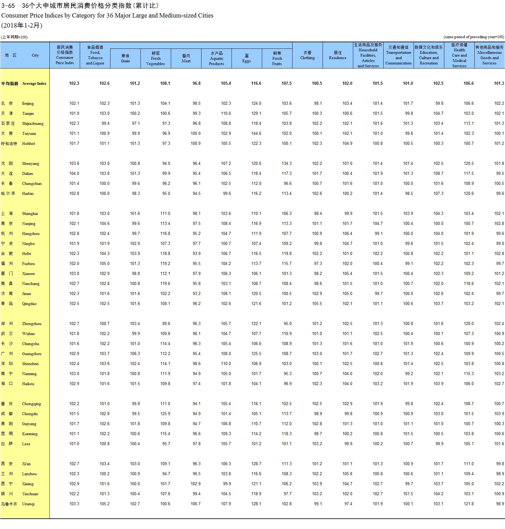 3-65 36个大中城市居民消费价格分类指数(累计比)(2018年1-2月)