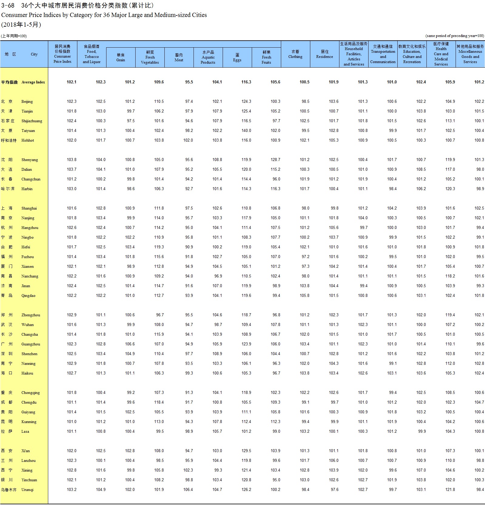 3-68 36个大中城市居民消费价格分类指数(累计比)(2018年1-5月)