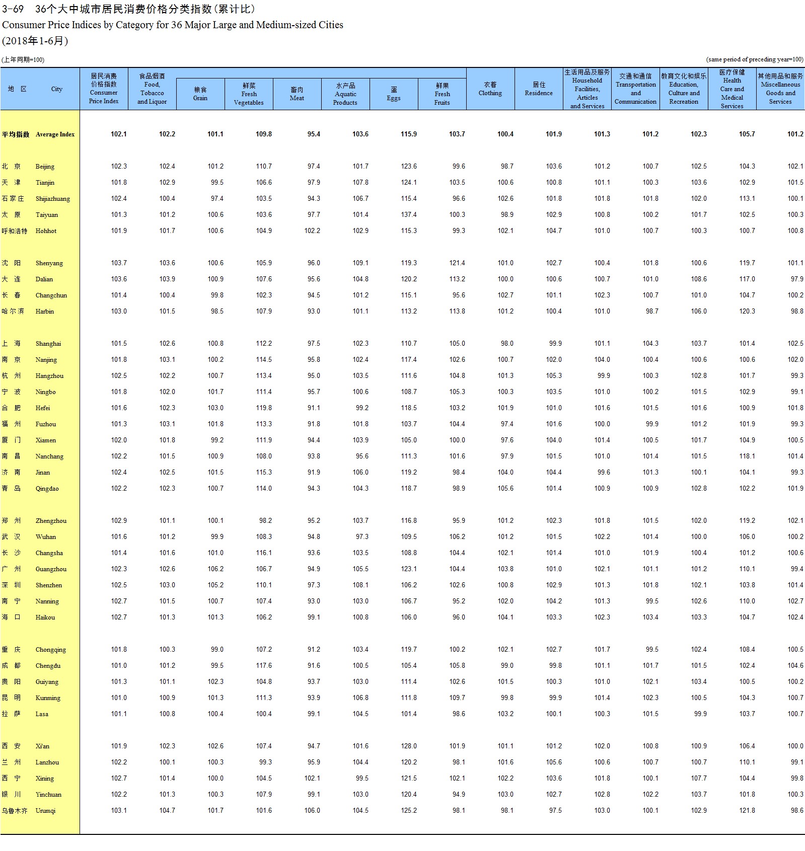 3-69 36个大中城市居民消费价格分类指数(累计比)(2018年1-6月)