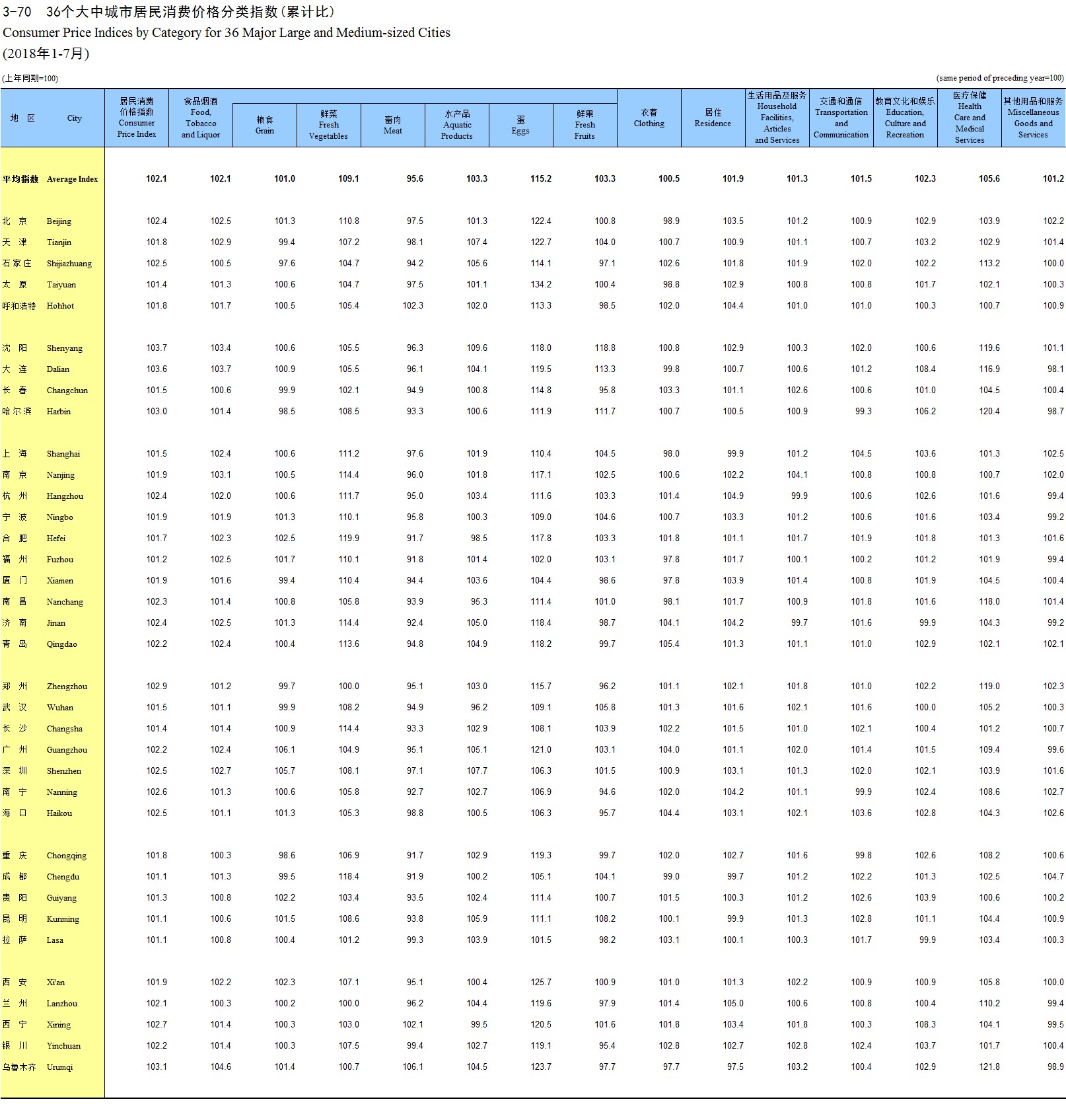 3-70 36个大中城市居民消费价格分类指数(累计比)(2018年1-7月)