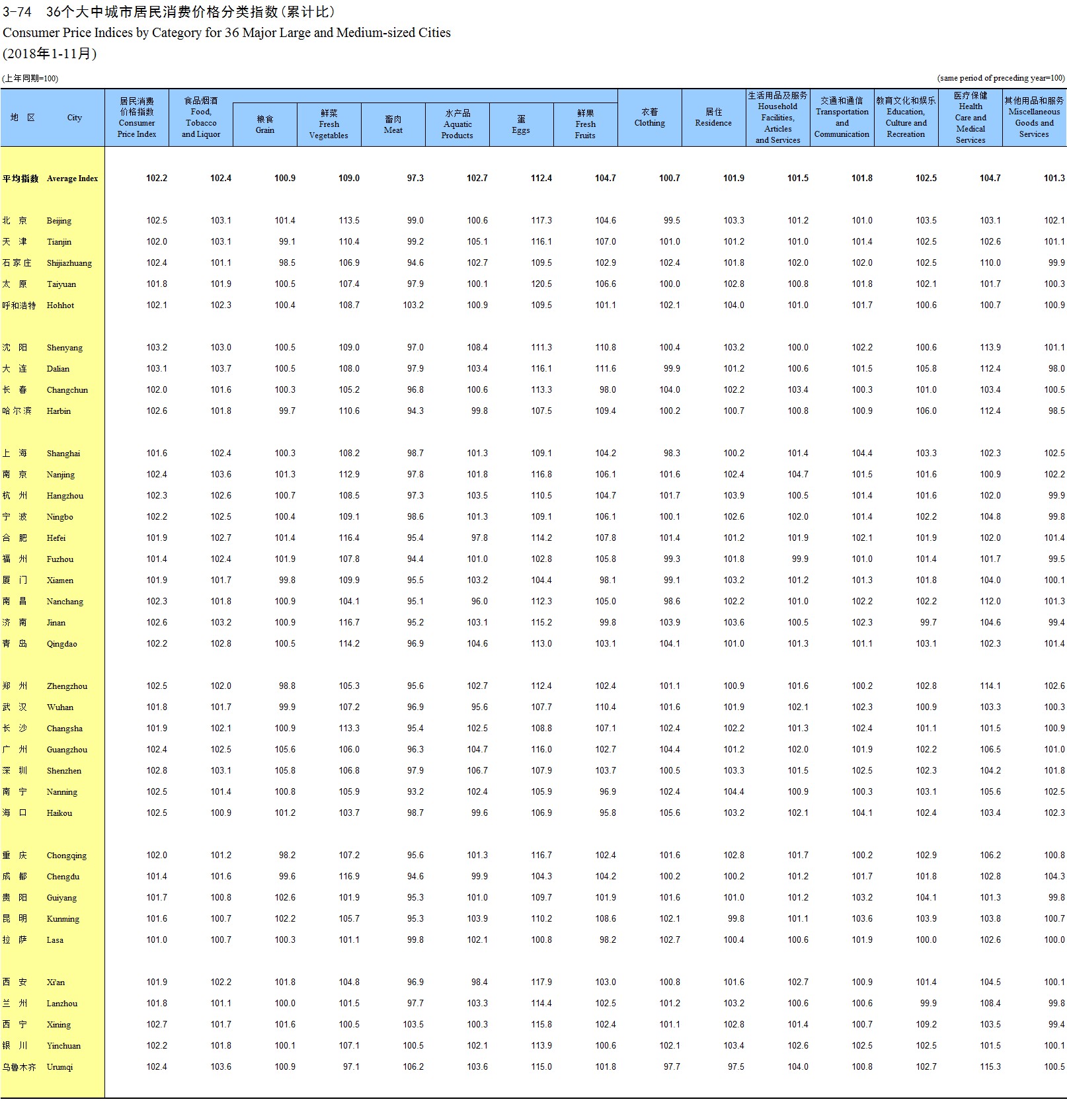 3-62 36个大中城市居民消费价格分类指数(同比)(2018年11月)