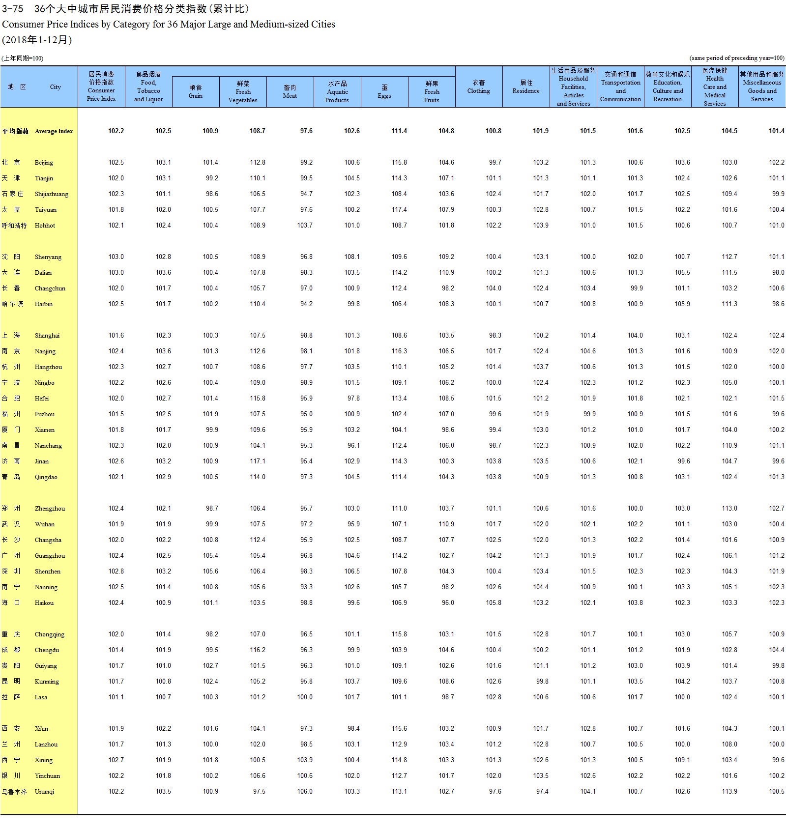 3-75 36个大中城市居民消费价格分类指数(累计比)(2018年1-12月)