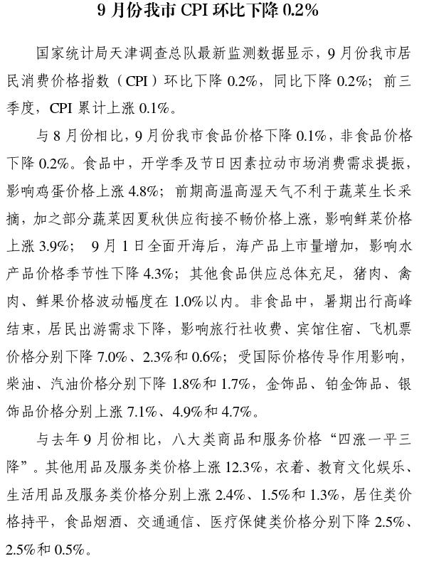 解读:消费价格调查处解读9月份我市CPI环比下降0.2%