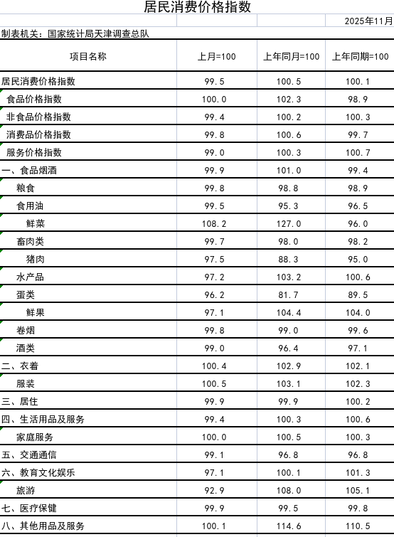 数据:天津市2025年11月居民消费价格指数