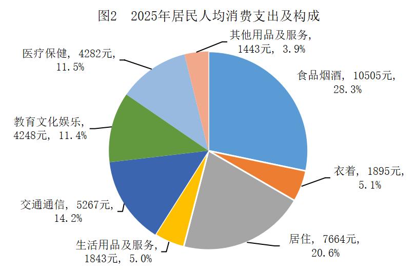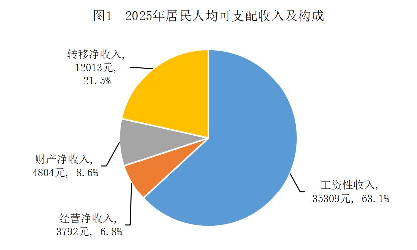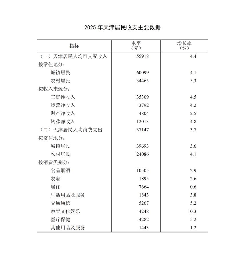 一、居民收入情况 2025年,天津居民人均可支配收入55918元,比上年增长4.4%。其中,城镇居民人均可支配收入60099元,增长4.1%;农村居民人均可支配收入34465元,增长5.3%。 ![]() 按收入来源分,2025年,天津居民人均工资性收入35309元,增长4.5%,占人均可支配收入的比重为63.1%;人均经营净收入3792元,增长4.2%,占人均可支配收入的比重为6.8%;人均财产净收入4804元,增长2.5%,占人均可支配收入的比重为8.6%;人均转移净收入12013元,增长4.8%,占人均可支配收入的比重为21.5%。 二、居民消费支出情况 2025年,天津居民人均消费支出37147元,比上年增长3.7%。其中,城镇居民人均消费支出39693元,增长3.6%;农村居民人均消费支出24086元,增长4.1%。 ![]() 2025年,天津居民人均食品烟酒消费支出10505元,增长2.9%,占人均消费支出的比重为28.3%;人均衣着消费支出1895元,增长2.6%,占人均消费支出的比重为5.1%;人均居住消费支出7664元,增长0.6%,占人均消费支出的比重为20.6%;人均生活用品及服务消费支出1843元,增长3.8%,占人均消费支出的比重为5.0%;人均交通通信消费支出5267元,增长5.2%,占人均消费支出的比重为14.2%;人均教育文化娱乐消费支出4248元,增长10.3%,占人均消费支出的比重为11.4%;人均医疗保健消费支出4282元,增长5.2%,占人均消费支出的比重为11.5%;人均其他用品及服务消费支出1443元,增长1.2%,占人均消费支出的比重为3.9%。 ![]() 附注: 1.指标解释 居民可支配收入是指居民可用于最终消费支出和储蓄的总和,即居民可用于自由支配的收入,既包括现金收入,也包括实物收入。按照收入的来源,可支配收入包括工资性收入、经营净收入、财产净收入和转移净收入。 居民消费支出是指居民用于满足家庭日常生活消费需要的全部支出,既包括现金消费支出,也包括实物消费支出。消费支出包括食品烟酒、衣着、居住、生活用品及服务、交通通信、教育文化娱乐、医疗保健以及其他用品及服务八大类。 季度收支数据中未包括居民自产自用部分的收入和消费,年度收支数据包括。 2.其他说明 部分数据因四舍五入的原因,存在总计与分项合计不等的情况。 |