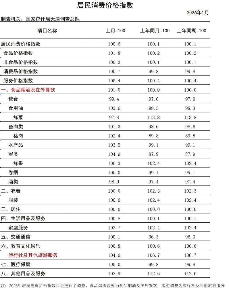 数据:天津市2026年1月居民消费价格指数